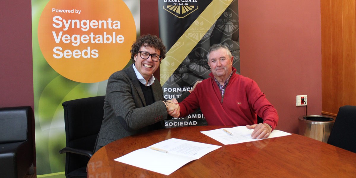 El presidente de la Fundación Miguel García Sánchez, Miguel García y el gerente de la unidad de negocio de semillas hortícolas para el suroeste de Europa de Syngenta, Luis Martín, han firmado un acuerdo estratégico de colaboración, por el que ambas entidades trabajaran de forma conjunta, en la formación de los agricultores, así como en el fomento de una agricultura sostenible y comprometida con el medio ambiente.