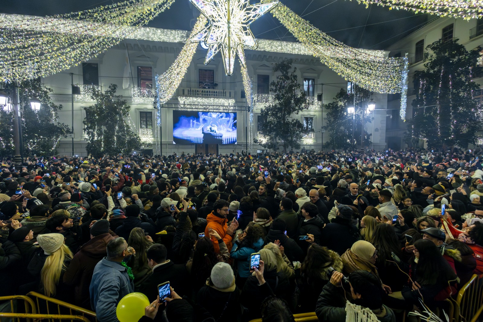 Las campanadas desde el reloj municipal estuvieron acompañadas de un espectáculo piromusical, con fuegos artificiales sincronizados con el himno de la candidatura Granada 2031. La celebración arrancó a partir de las 22.30 horas con el reparto gratuito de uvas y bolsas de cotillón, mientras que la programación musical comenzó antes de la medianoche con una actuación desde los balcones del Ayuntamiento y continuó tras las campanadas con un concierto en el escenario central de la plaza hasta bien entrada la madrugada.