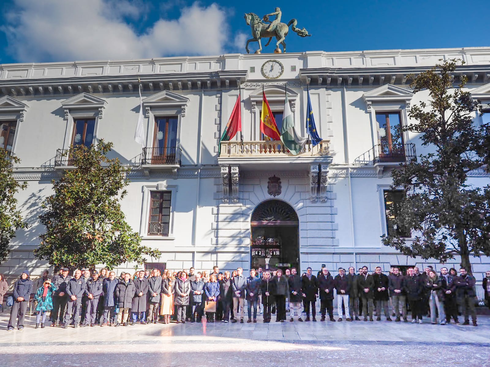 El Ayuntamiento de Granada ha expresado este lunes su dolor y solidaridad con las víctimas del grave accidente ferroviario ocurrido el domingo en Adamuz (Córdoba) guardando un minuto de silencio a las puertas de la Casa Consistorial, en la Plaza del Carmen, con la alcaldesa al frente de la corporación municipal.
