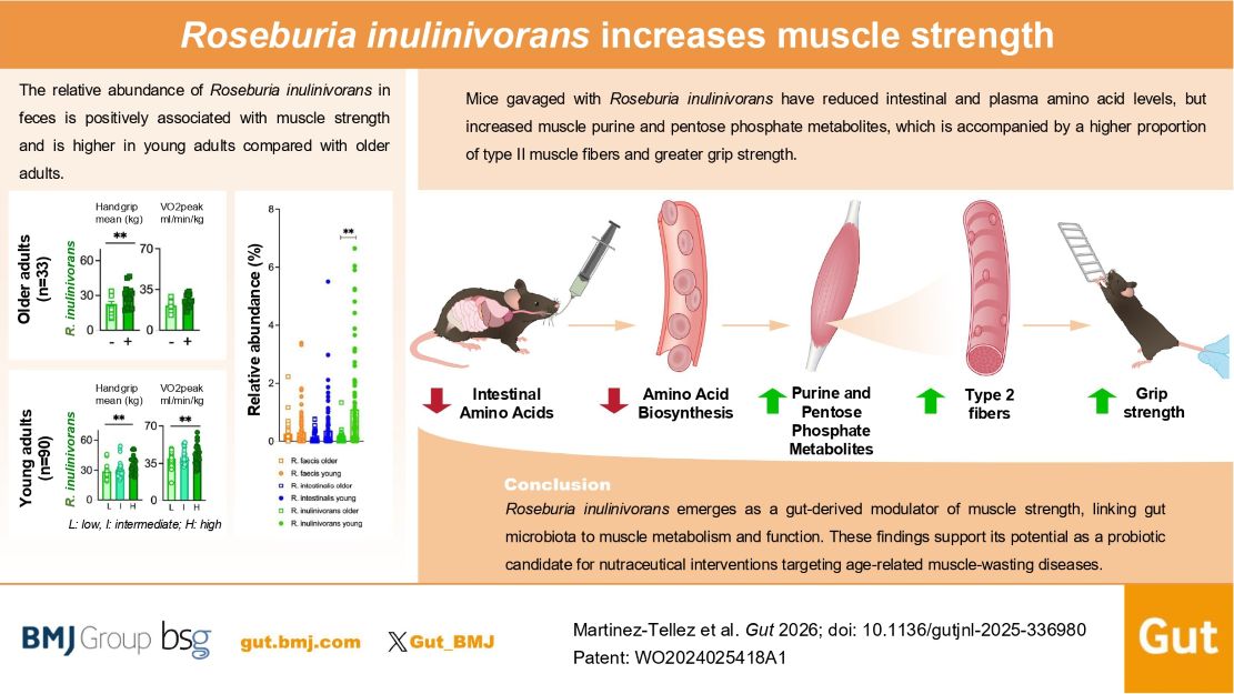 Entre los numerosos grupos bacterianos detectados, destaca el género Roseburia, ya que su abundancia se asocia con el aumento de la masa muscular y la fuerza. En particular, una especie —‘Roseburia inulinivorans’— muestra relación con la condición física.