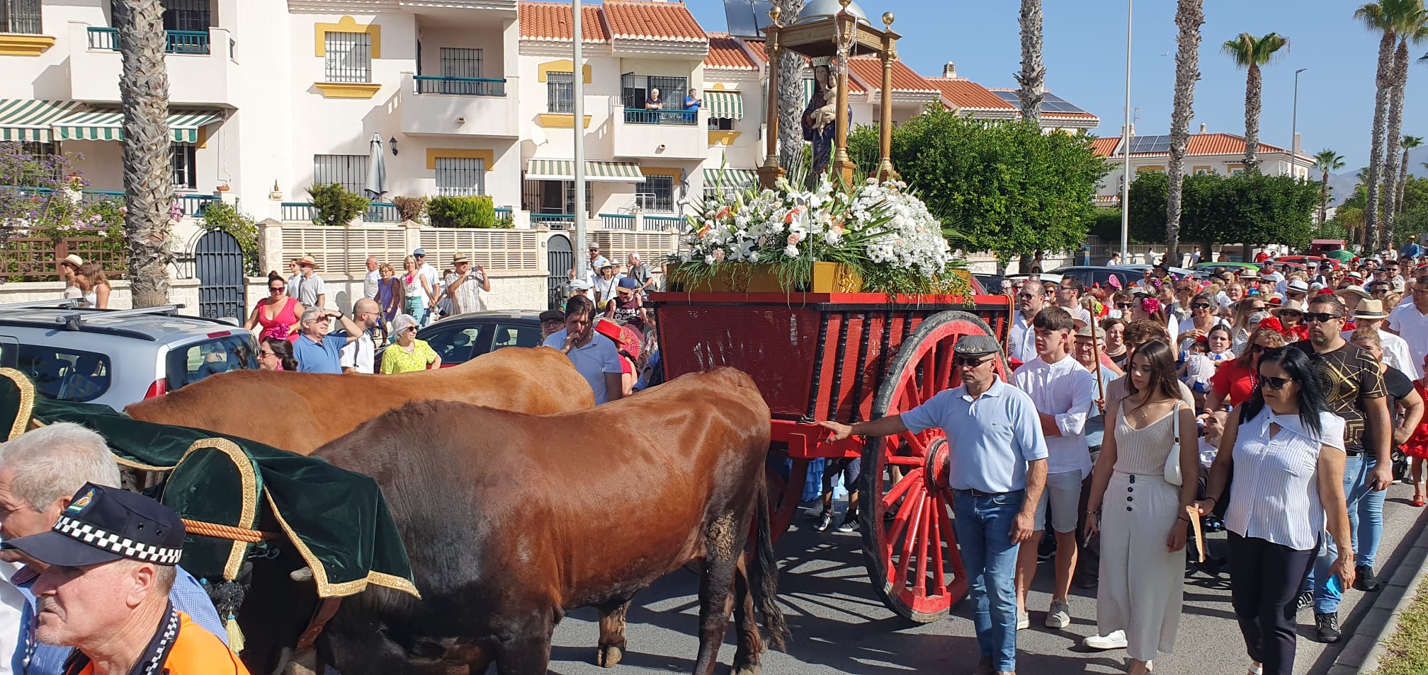 Salobreña: Las fiestas patronales en honor a la Virgen del Rosario celebran su día grande el primer domingo de octubre con la tradicional Romería del Sur de Granada, en la que la patrona, este año arrastrada por mulos por motivos sanitarios y económicos, procesiona acompañada de hermandad, caballistas, banda, carrozas y miles de fieles.