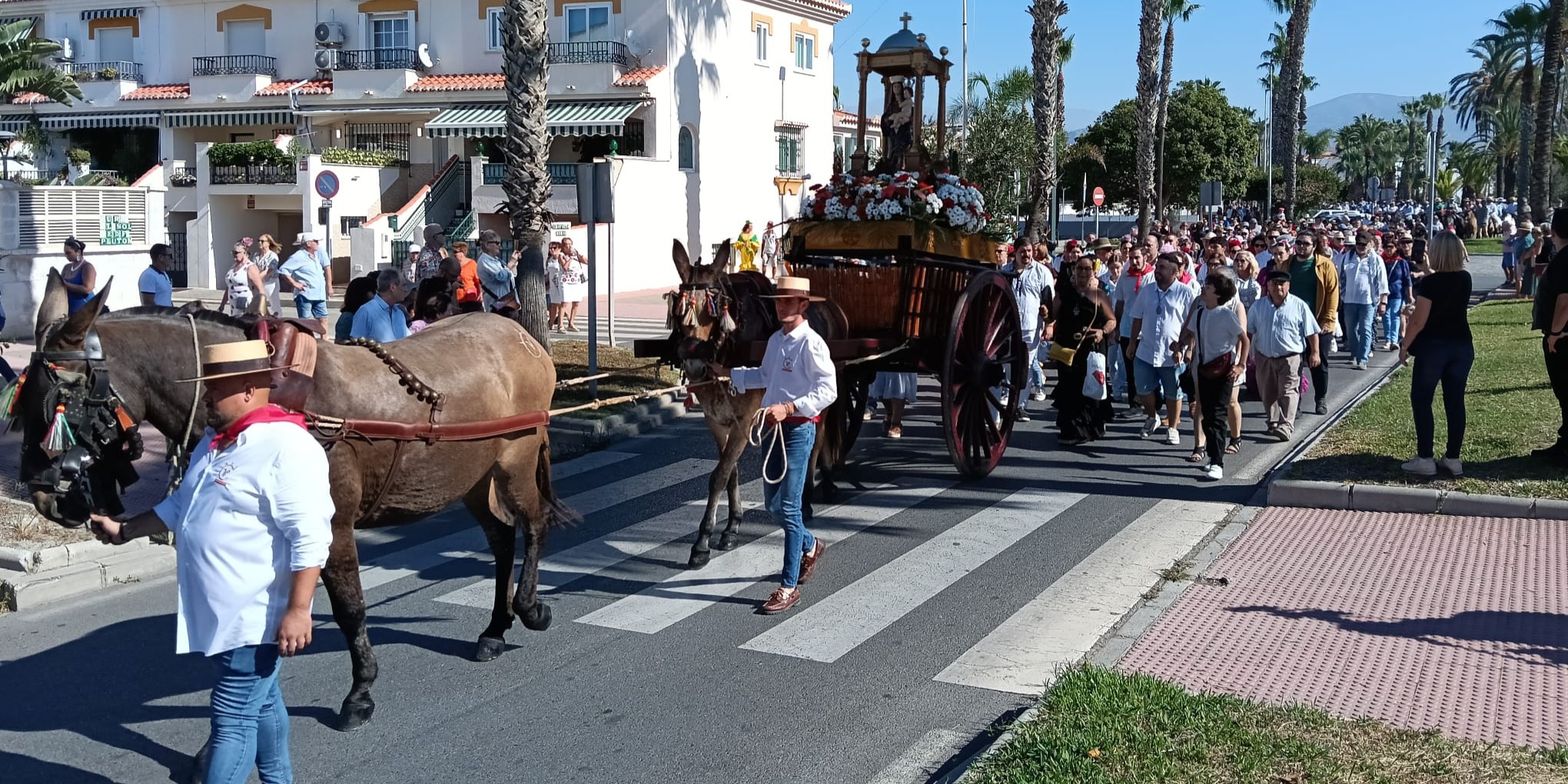 La jornada comenzó con un desfile encabezado por la Banda Municipal de Música, seguido de la carreta que transportaba a la Virgen del Rosario, patrona de la villa. La imagen, llevada en un carro tirado por mulos y acompañada de fieles ataviados con trajes de flamenca y de corto, avanzó entre vítores y cantos rocieros. Tras ella, jinetes a caballo y coloridas carrozas completaban la comitiva, que cerró el Club Vespa de Salobreña, aportando un toque singular antes de dirigirse hacia la playa.